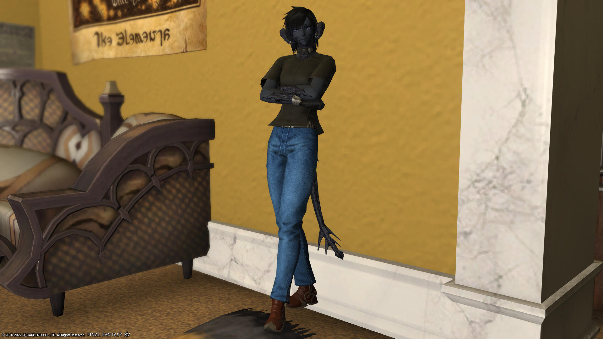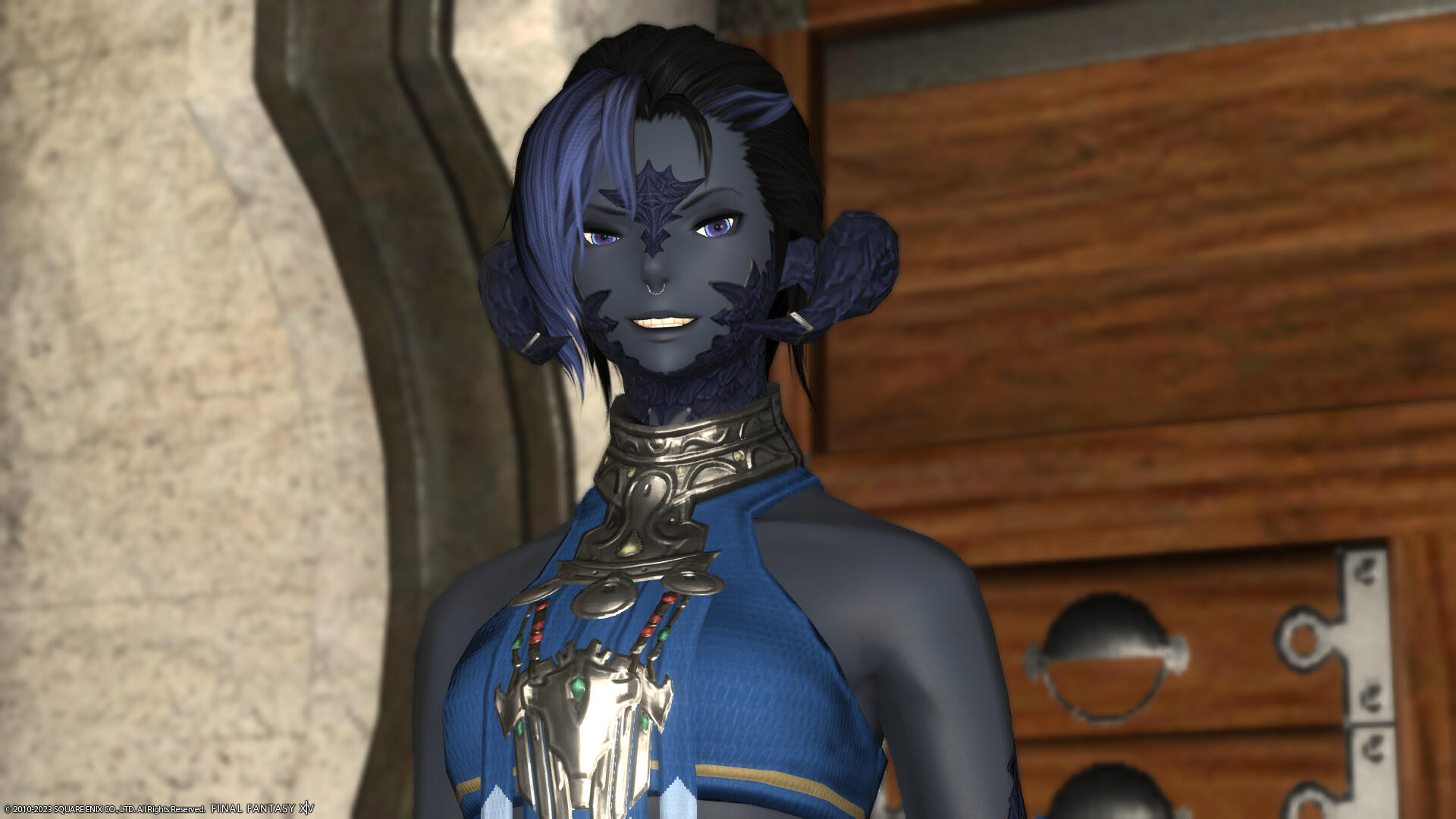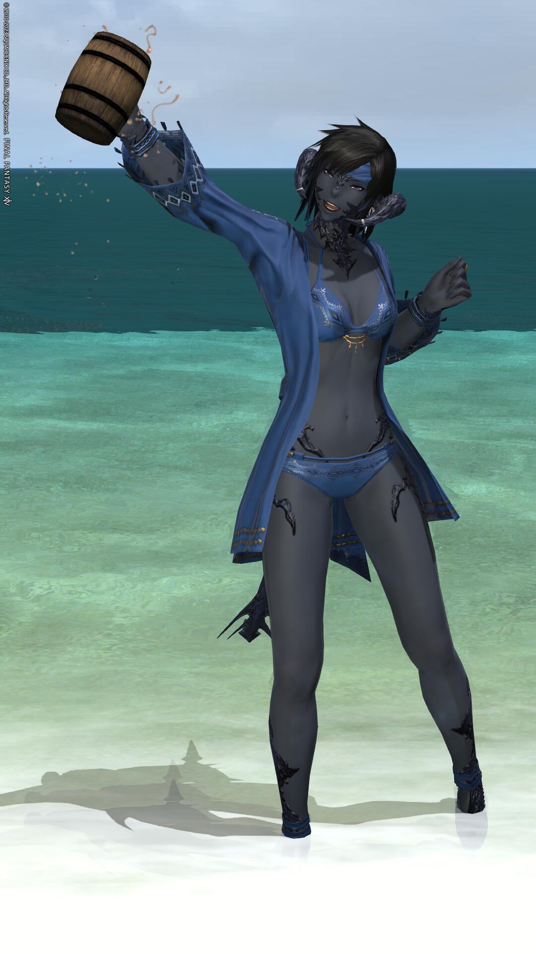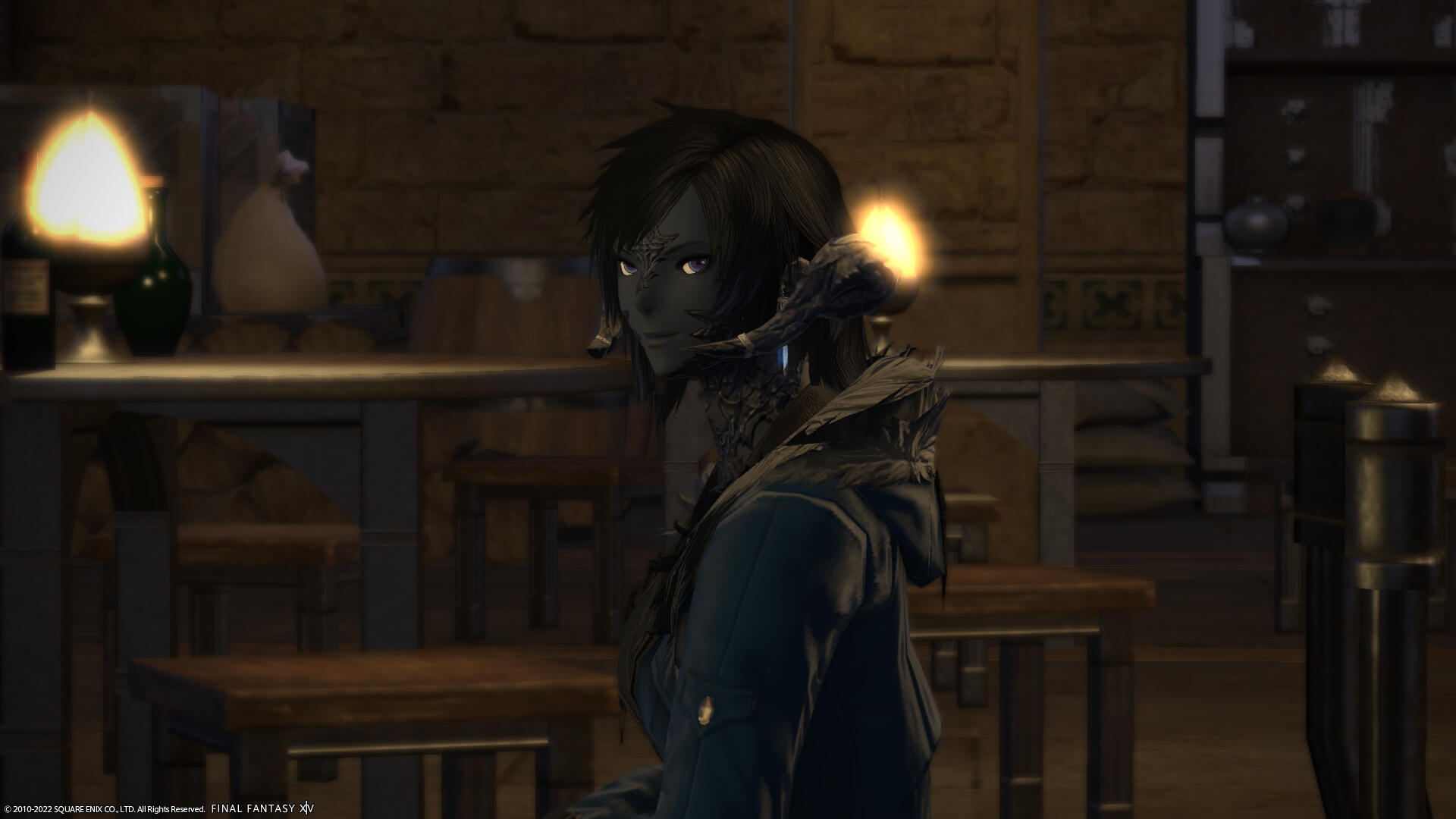 The Last Round: “Never stops raining here, should have never left the steppes.” The small, hooded figure muttered as she ran across the bridges connecting Limsa Lominsa’s upper decks, only stopping when she finally arrived at her destination. Juskia Dotharl peered around The Drowning Wench and took a step towards the stairs that led to the Mizzenmast Inn where she had been staying since arriving in the city. The hooded coat she wore hid her from prying eyes, the only clue to what she might be was the long black scaly tail that poked from the back. As she looked around the circular tavern she paused after a few paces as she considered. “Looks like a quiet night tonight, maybe I can have one or two before I head to my room and dry off.” Two dark blue hands appeared from under the cloak to pull the hood further over her face as she headed towards the bar. Taking one last look around, she sat down and dropped a few gil onto the counter. Noticing the look Baderon was giving her she held up a hand and shook her head. “Don’t worry. Won’t be any trouble tonight. Just having a couple before I go to my room. Besides, the Yellowjackets said I send one more to the infirmary, it doesn't matter if I started it or not, I’m being tossed out of the city. So, no fights tonight, I want a dry place to sleep.” Baderon simply gave her a nod and placed the mug of ale down in front of her. “See that ye don’t lass. Ye been a good ‘elp with all the mess lately. ‘ate to lose another ‘venturer that enjoys the job.” With another shrug, she nods and reaches for the mug taking a long pull from it. It’s not like she could help that the Dotharl reputation had gotten out and people liked picking a fight with her because of it. Of course, she was not one to walk away from said challenges either. At least it looked like the heavy rain was keeping everyone from venturing out this evening. Time passed, one or two mugs soon turned into a half dozen and more. Who was counting? The ale was one thing she had developed a taste for after she had traveled to the west, following her Khatun, Sadu, as part of the Ilsabard Contingent. After the battles calmed down she decided to explore more of this strange land curious about what the world had to offer, what other battles she could enjoy. But the ale, that was one thing she very much enjoyed almost as much as the thrill of battle. Most of the gil she had earned, that wasn’t used to pay for her room and food, she spent down here sampling all the different drinks they had or the occasional game of chance. As the night wore on the rain let up, and soon more and more people were coming in. At this point Juskia seemed not to care anymore and was just enjoying her evening, now ordering a large plate of different meats, cheeses, and bread to go with the ale. She might be small in frame, but it seemed she did handle her alcohol well, the food would only help, that and she was hungry. Of course if she hadn’t been drinking as much she might have noticed the very type of people she was trying to avoid wandering in. Two boisterous groups of roegadyn and hyur were in a very heated game of dice off to one side of an inn. When suddenly one of them quickly stands and tosses the table to the side. “Dem dice are loaded!” Juskia’s head snaps up and looks towards the crowd which was getting louder by the moment. It didn’t take her or anyone else long to figure out what was about to happen. With a heavy sigh she downs the mug of ale and grabs a loaf of bread, tearing out the center she stuffs as much of the meat and cheese that was left inside and waves to Baderon who was already pointing a finger at her to not get involved. “I’ll be taking this up to my room. Hope this won’t be too much of a mess for you.” She said with a smile. With that as the fight inevitably broke out Juskia quickly made her way towards the stairwell that would carry her to her room. At least that was the plan. But fate, or maybe dumb luck, had a different idea as an errant bottle flew across the room to smash into the back of the diminutive figure’s head. The force of the impact shattered the glass and sent her stumbling forward, and her makeshift sandwich to the ground. A rand reached up to feel the back of her head as she stood there quietly for a few seconds, her shoulders heaving underneath the cloak before she finally spun on her heel towards the group. “All right. Yah wants me so much! Was going to let you lot off easy tonight!” She yells out her hand grabbing the edge of the cloak, a pale whitish light appearing from underneath. “But now my turn for some fun! Sadu to me!” She yells out as she pulls off the cloak and tosses it aside. Standing there was the small Xaela, dark blue almost black skin adorned with black scales and horns. She had shoulder length black hair with streaks of blue running through it. She wore an angry scowl, but her lips were turned up with a frightening grin. Under the cloak she was dressed in the typical Dotharl garb of light cloth and leather, adorned with blue feathers. The only thing that stood out were the long leather forearm covers which were now covered with brightly glowing runes. Beside her seemingly out of nowhere the aether coalesced and a light blue carbuncle appeared at her side. “Get em!” She called out to the magical beast as it charged into the group of people. Unlike most of these aetherical beings, this carbuncle fought with tooth and claw. It leapt up onto the first person it ran into only to have a few glowing balls of force smacking into the fighters indiscriminately around it. With a laugh she waved a hand over one forearm, the glowing aether forming into another ball as she threw it too into the crowd. The chilling laugh only grew as it sent a few people flying. As dotharl and carbuncle entered the fray a few voices yelled out in alarm as they realized not only there were more people coming into the fight, but t